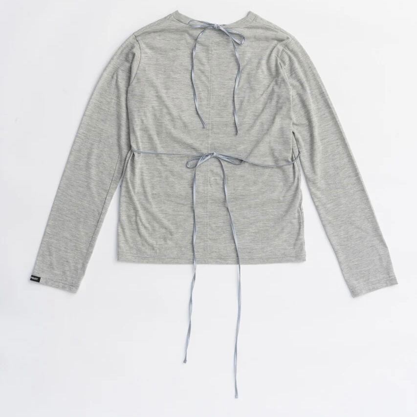 バストの下のストップを後ろで結ぶとシルエットが調整可能。肩ひもを首の後ろで結んだり、あえてそのまま垂らしたりとアレンジすることで気分を変えられる。