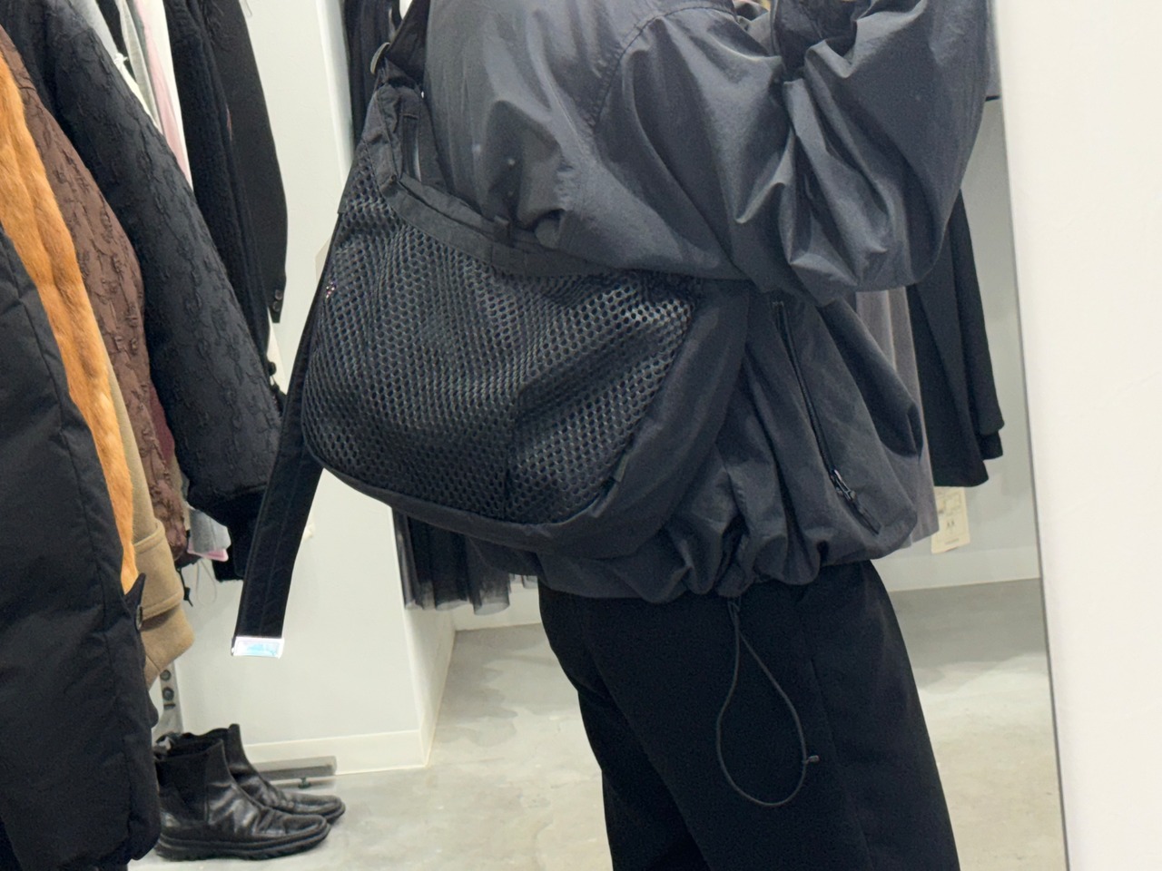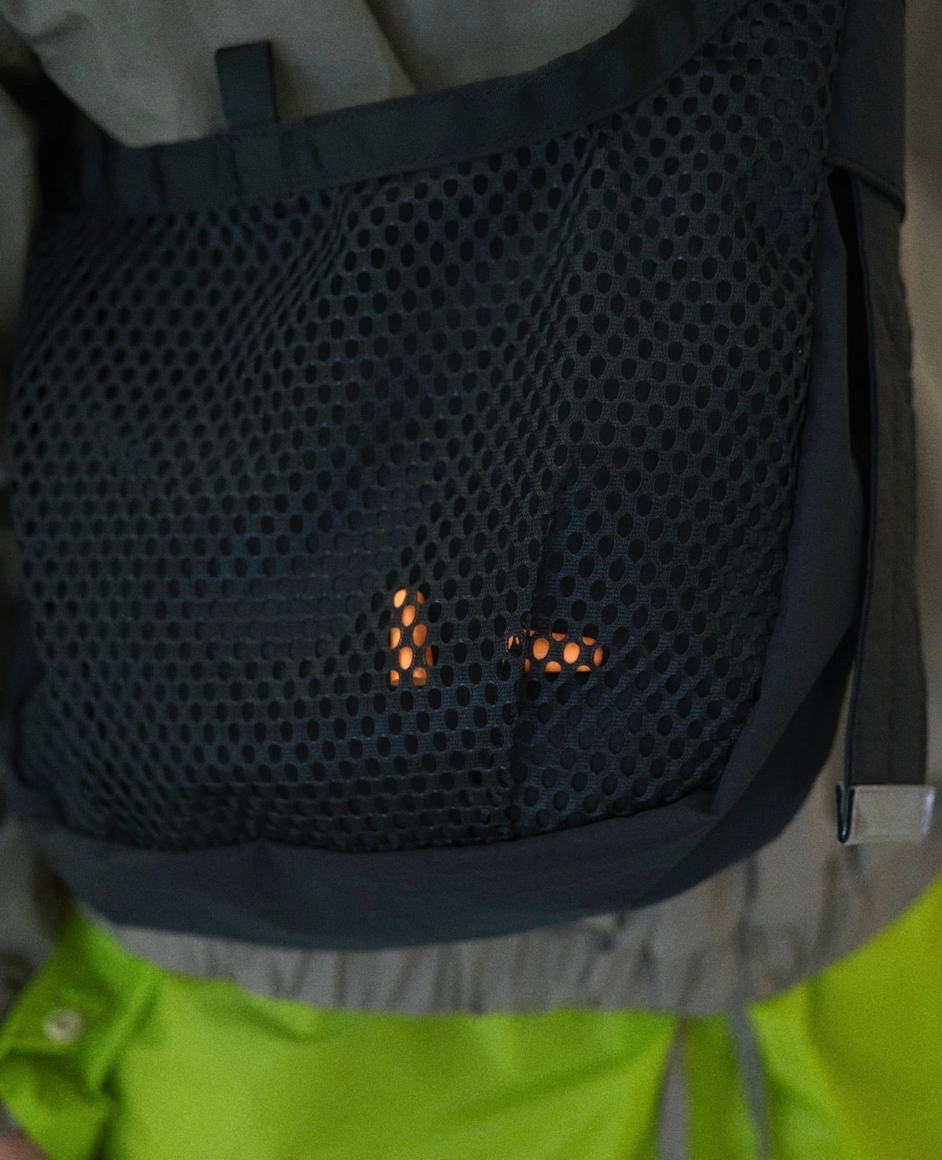 9Lの容量があり13インチのラップトップも入るサイズで、フロントの全面に設けられた外ポケットはメッシュ素材を採用し収納するアイテムによってバッグの表情も変化します。