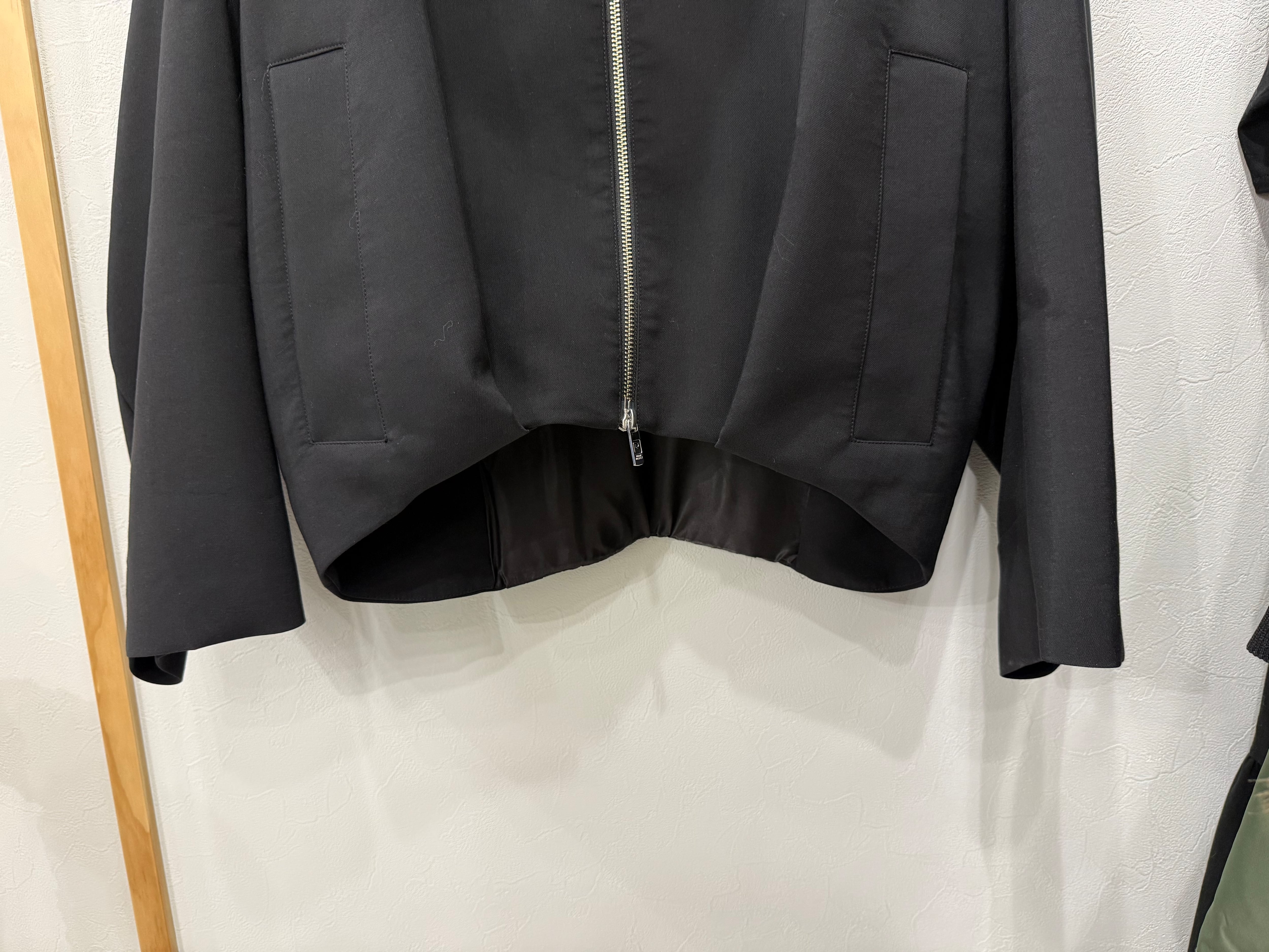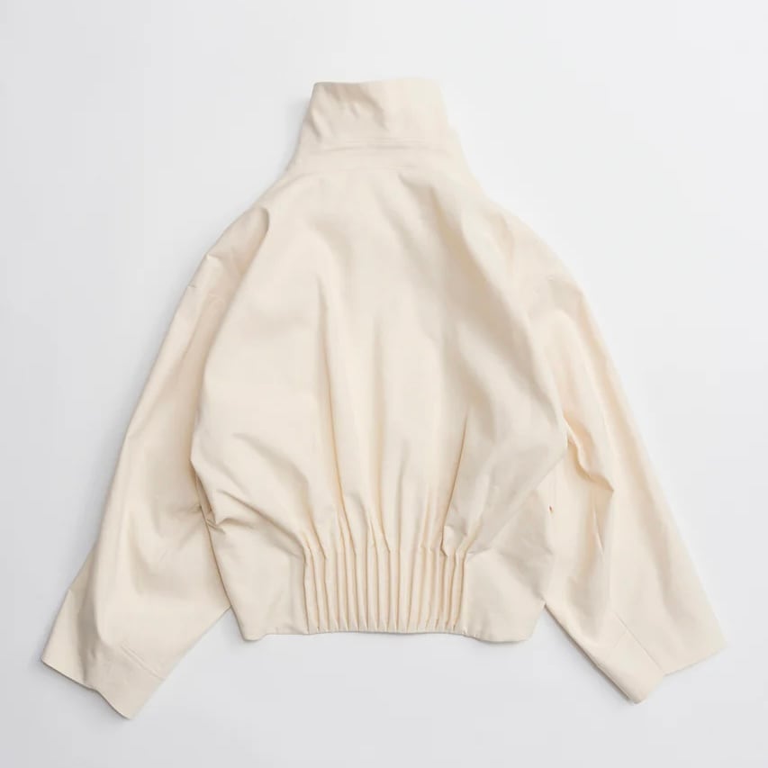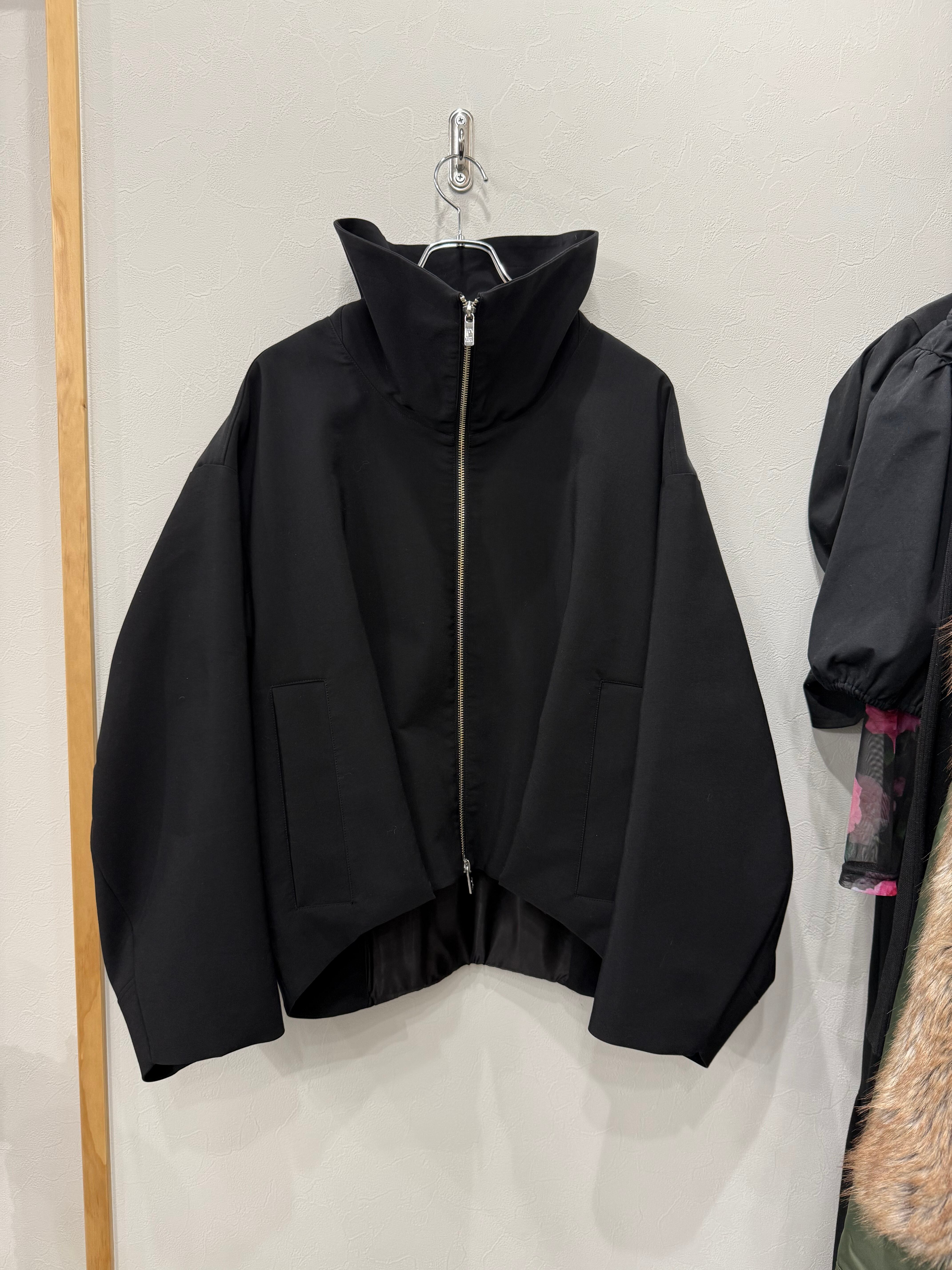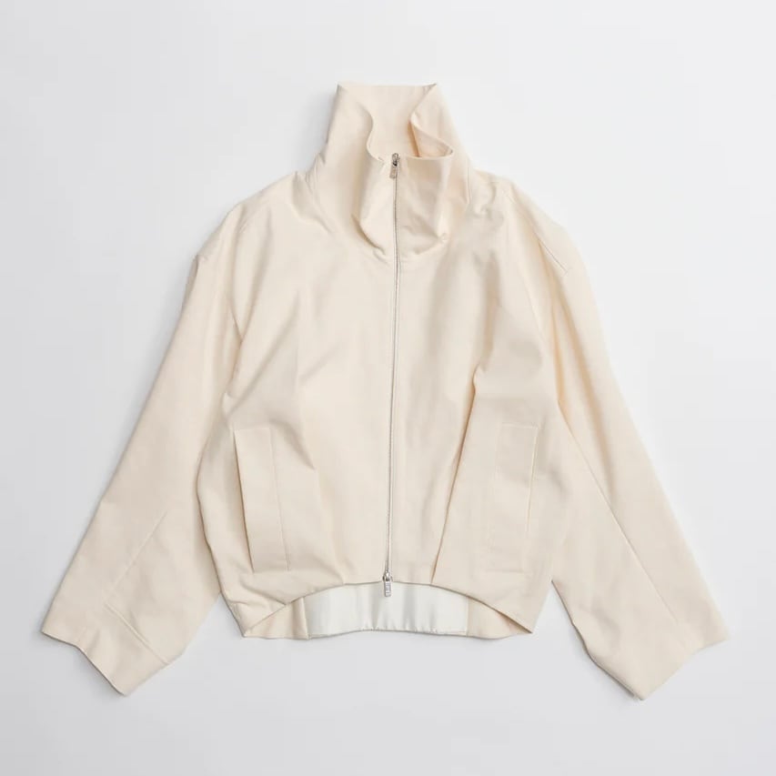 立ち上がる幅広のスタンドネックと、丸みを帯びた袖が特徴的なショートジャケット。