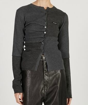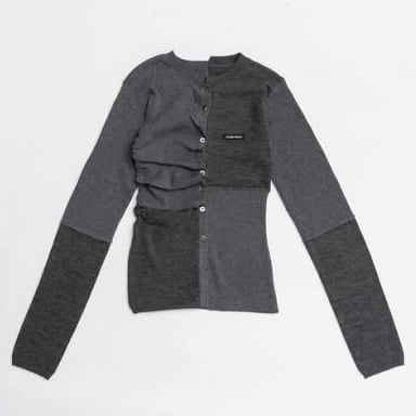 2素材使用し、左右をゆがませることでアシンメトリックな要素を散りばめたニット。