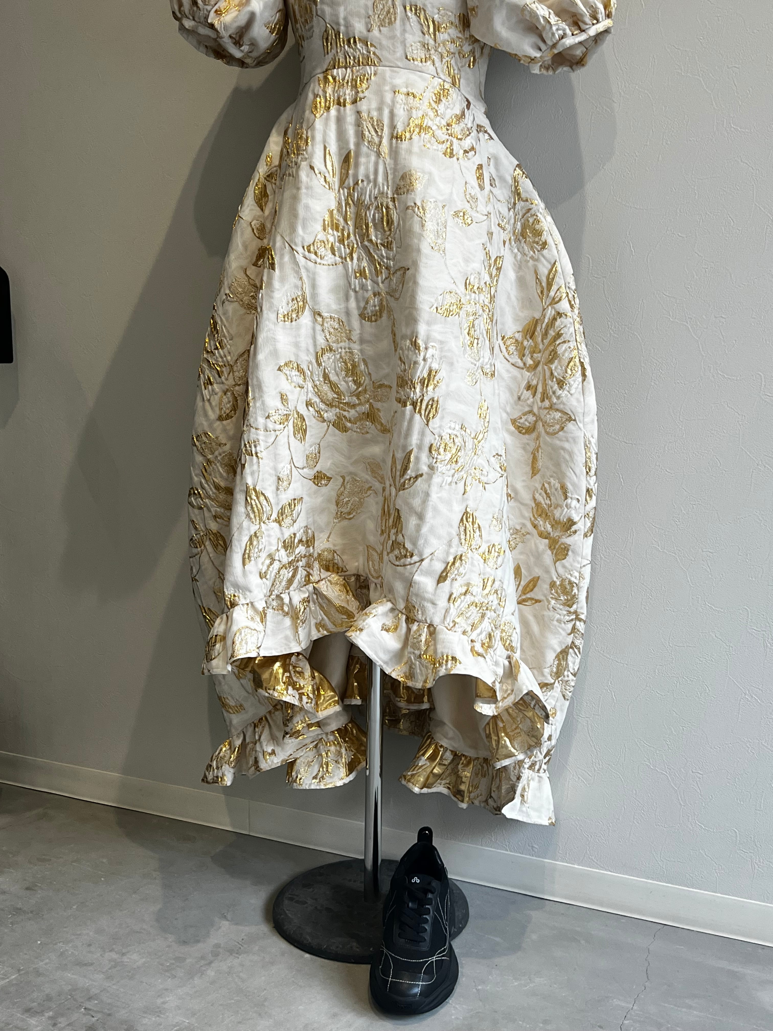 上品なゴールドフラワー柄の全体ジャガードドレス。パフスリーブ、膨らみのあるスカート部分はまるでお姫様ですが、オケージョン装い以外にもデイリーにはスニーカー合わせをお勧め。